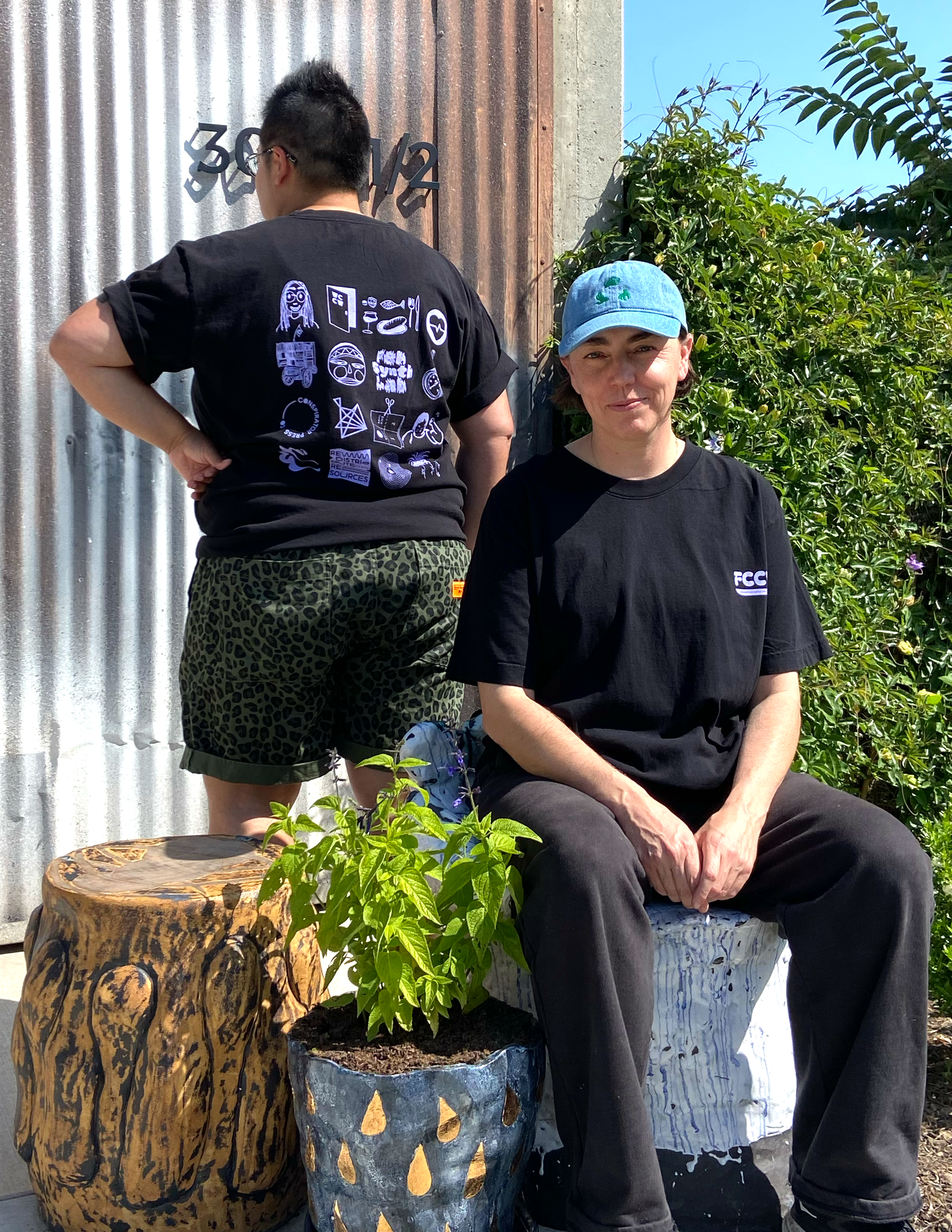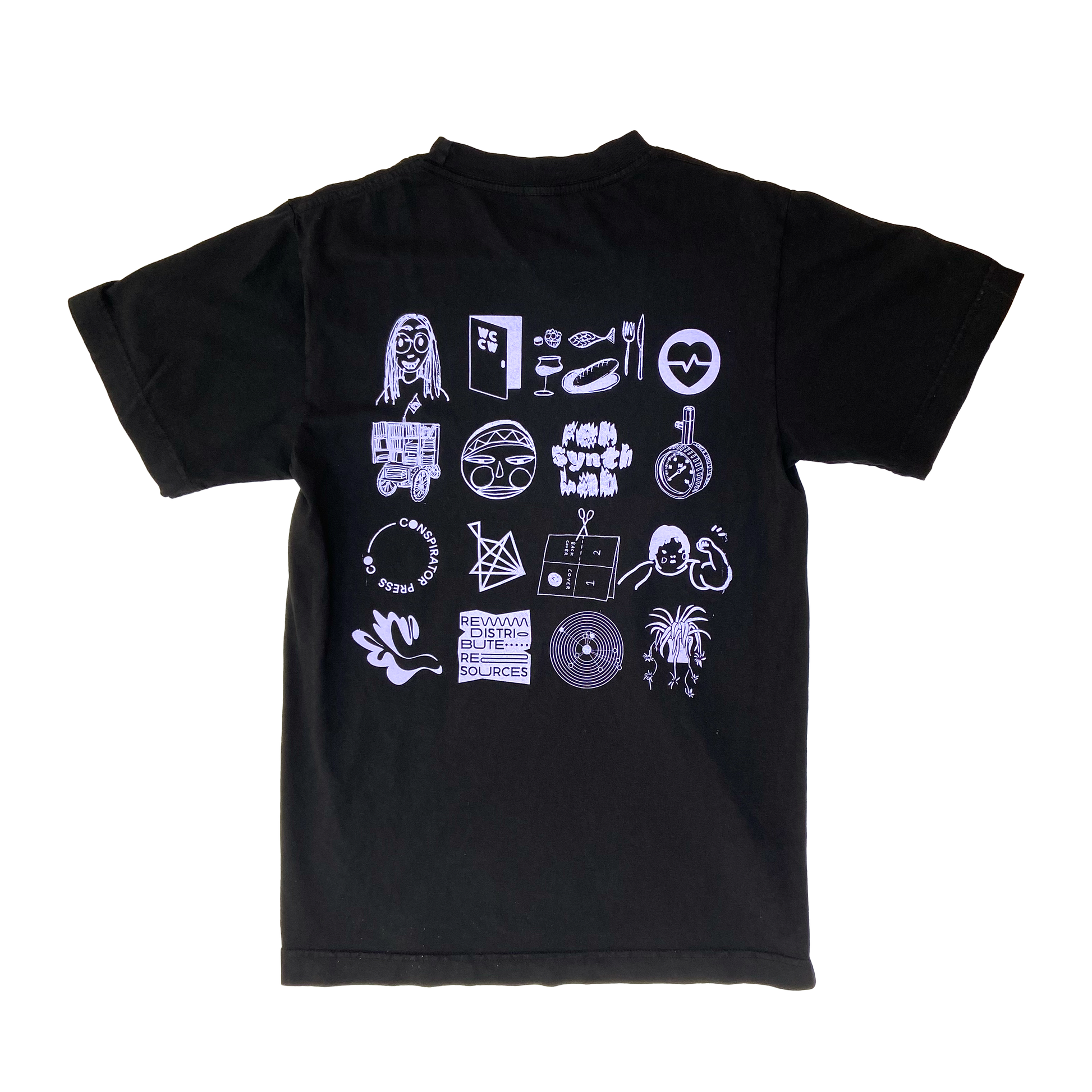 Our shirts are classic short-sleeve crewneck Trash Tees donated by EVERYBODY.WORLD in black, screenprinted with periwinkle ink. Design by Raquel Hazell, printed by Phoebe Unter.