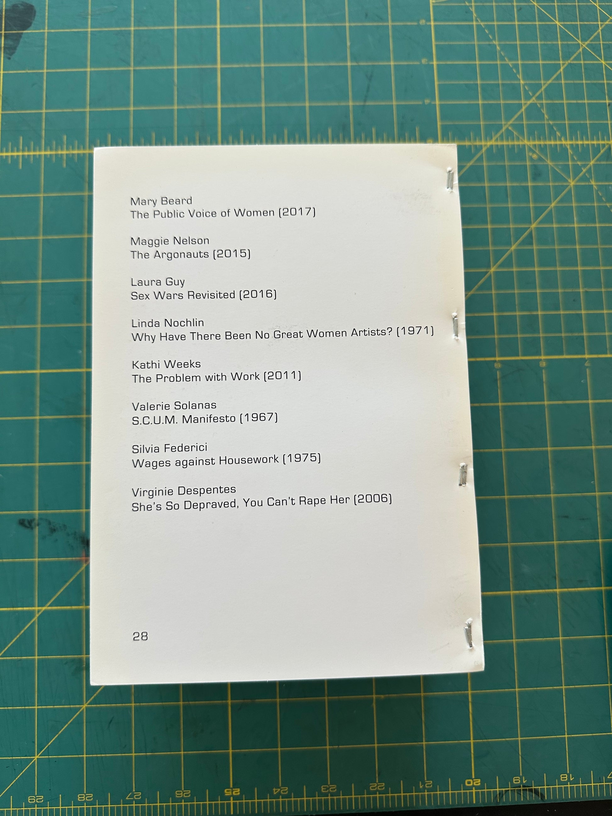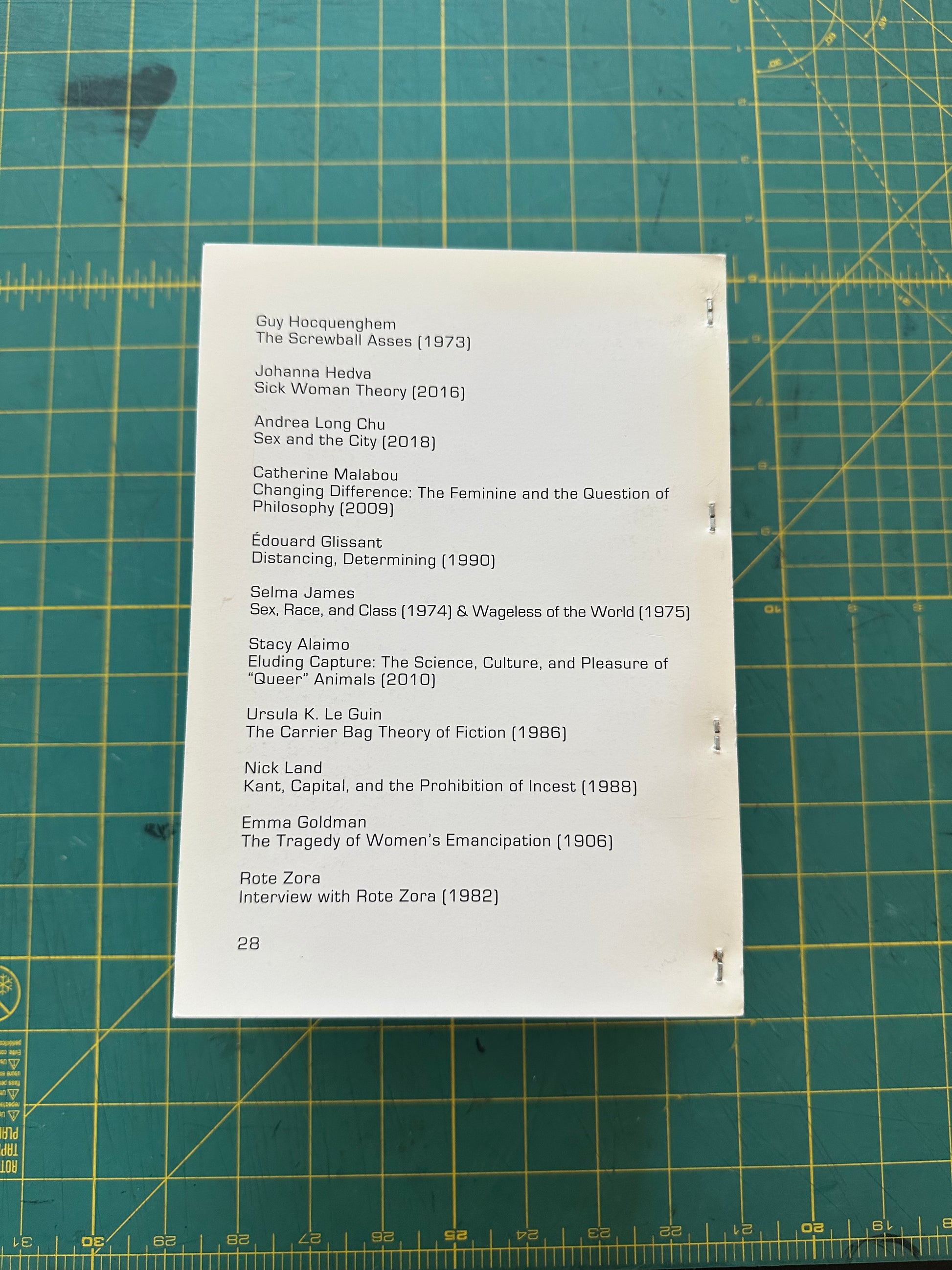 These reading materials have inspired Silvi Naçi's work in their FCCW residency and beyond — you can find all of the readers compiled by their Radical Sense reading group here. These are printed copies of Radical Sense Readers Volume 1, 2, 3, 4 or 5, staple bound, roughly 6 in. x 8 in.